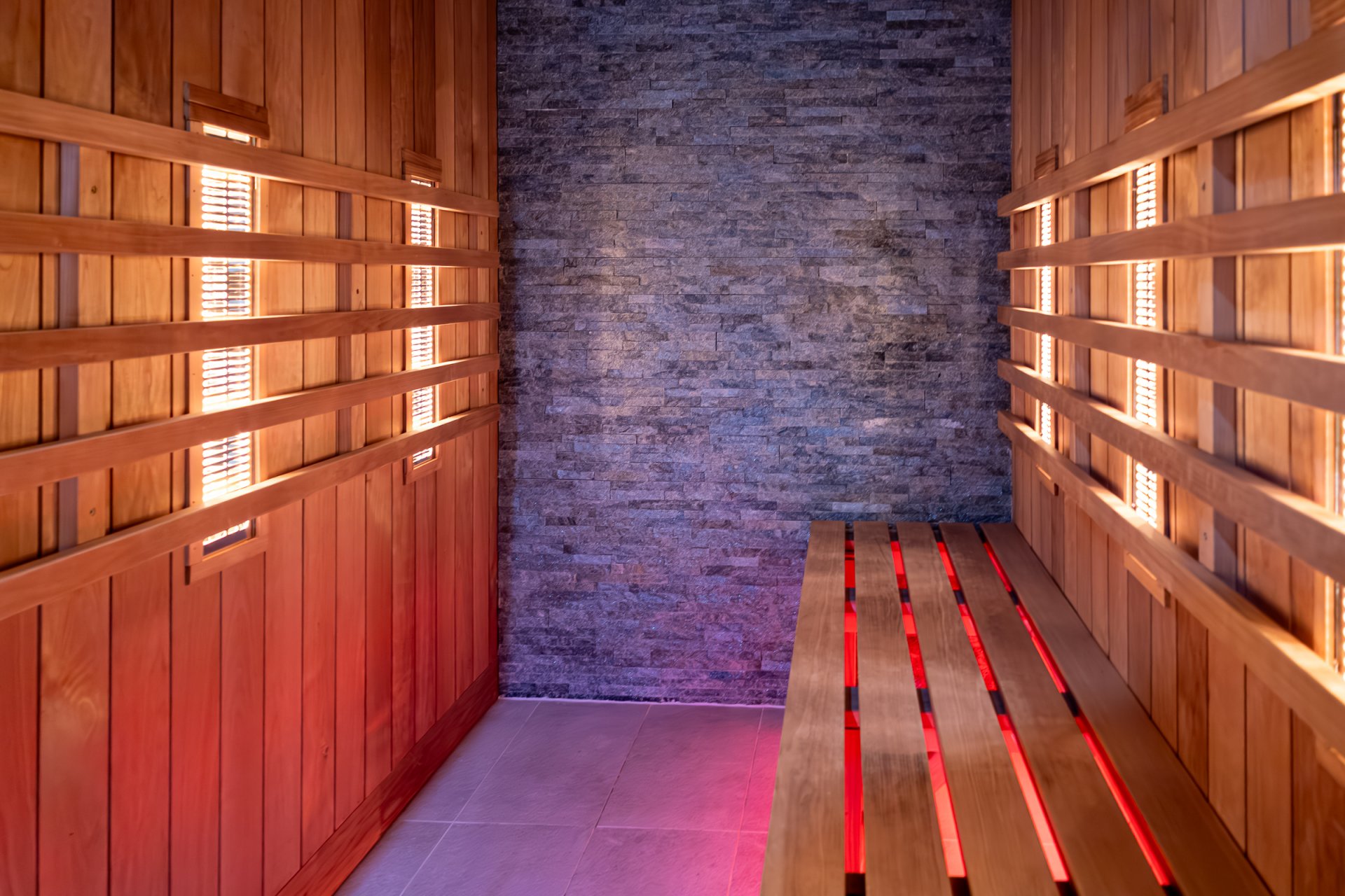 Wykonaliśmy saunarium a wnim saunę InfreRed na terenie Pływalni Miejskiej Bąbelek w Legnicy. Kabina wykończona została drewnem osika termo. Promienniki EOS zostały zamontowane dla 4 stanowisk. Dodatkowo wykonaliśmy ścianę frontową w formie przeszklenia oraz ścianę z łupka. Poza promiennikami źródłem światła jest też oświetlenie podławkowe typu LED.